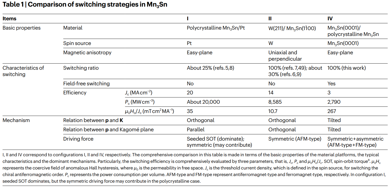 研究团队采用临界电流密度Jc、功耗Pc,以及反常霍尔矫顽力与临界电流密度的比值μ0Hc/Jc三项指标来综合评估翻转效率(表格1),新构型下,三项指标均比此前有了大幅优化,与铁磁相比,μ0Hc/Jc更是实现了两个数量级的提升。