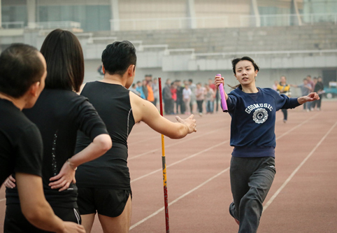 图为10乘60迎面接力比赛运动员交接棒瞬间。
