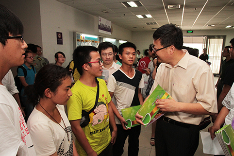 校长陈吉宁为走“绿色通道”的新生赠送爱心纪念封。记者 郭海军 摄