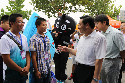 校党委书记胡和平与新生亲切交谈。记者 苑洁 摄