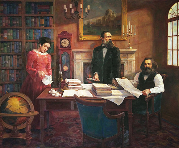除了王铁牛教授与郑艺教授的画作外,清华美院冯远教授的作品《在国际工人协会(第一国际)成立大会上》和宋克教授的作品《马克思为<纽约每日论坛报>撰稿》也出现在了展览上。冯远教授的画以仰视的视角描绘了马克思在国际工人协会成立大会上激情宣读成立宣言和纲领的场景。他被包围在满屋斗志昂扬的与会者之中,人们在鼓掌、喝彩,高高抛起的礼帽愈发衬出马克思伟岸的身影。宋克教授则刻画了一个更为安宁祥和的场景——马克思拿着报纸,注视前方,仿佛在沉思;恩格斯手握羽毛笔,望向窗外,眼神深邃,仿佛正在构思自己的文章。画面左边,马克思的夫人燕妮正在为两位革命斗士添茶,以显示她在这场时代巨变中的双重角色——不仅是一个家庭主妇,更是一位革命战友。