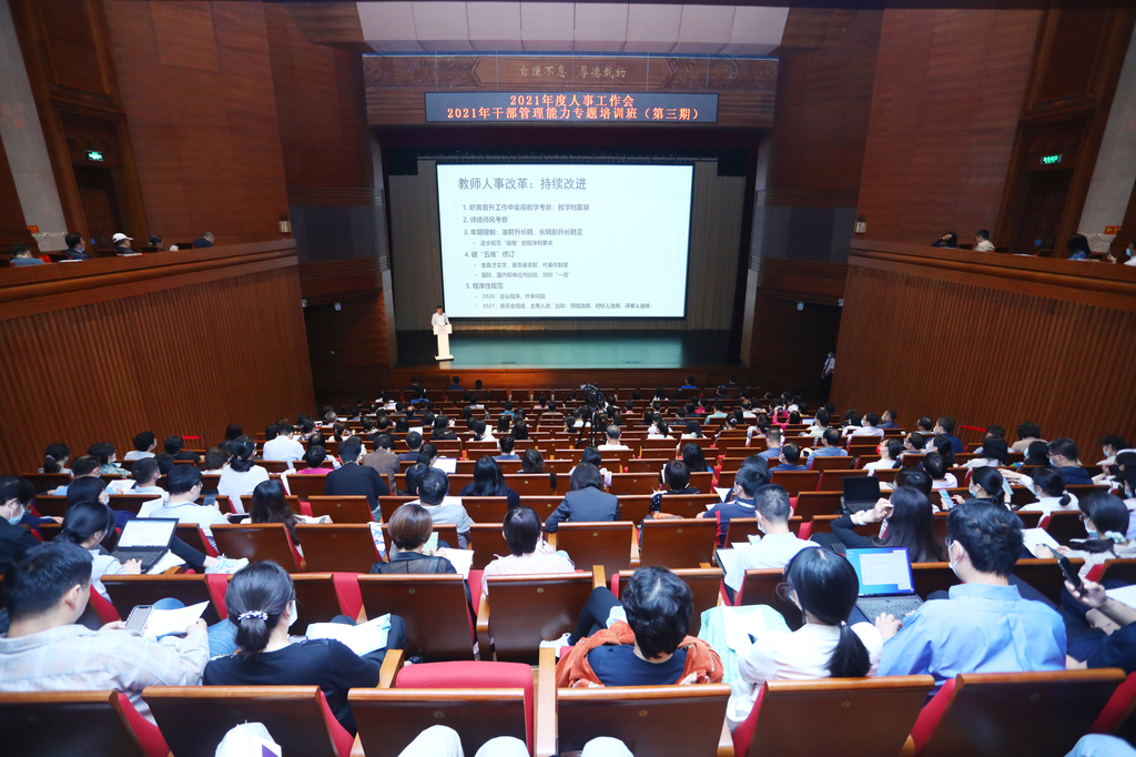 本次人事工作会采用“主会场+线上”方式进行,各院系、机关、后勤、支撑服务机构及附属单位的200余名主管人事领导和人事干部参加了现场会议,100余位人事工作者通过“荷塘雨课堂”观看会议直播。