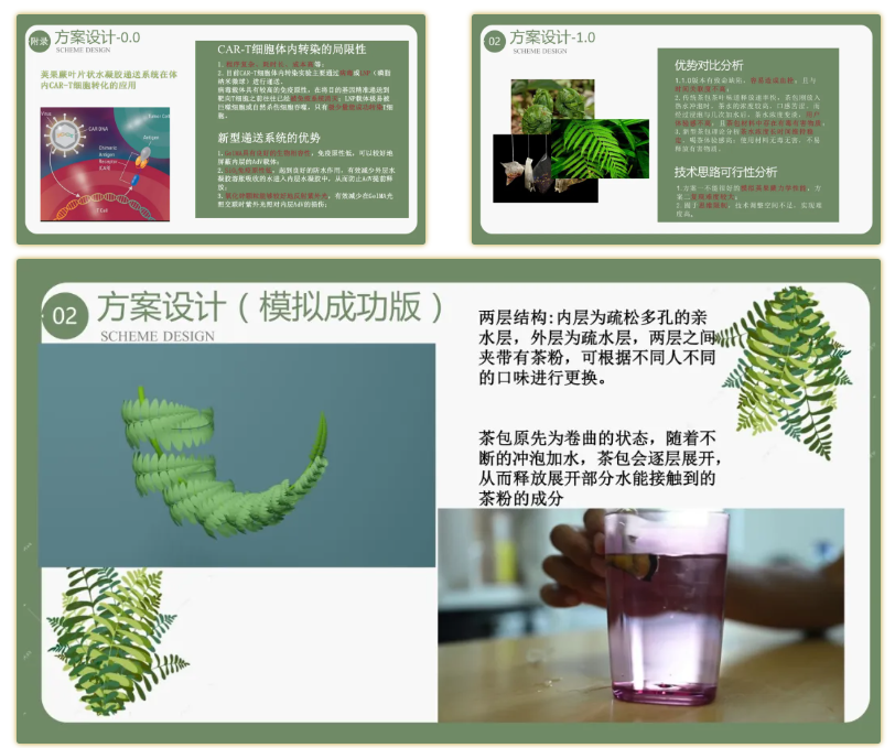 距离结课还有一周半的时间,应该继续深挖荚果蕨还是直接换个更取巧的植物从头做起? 在为先书院副院长王秀梅、材料学院副研究员孙晓丹、邱松等老师的共同帮助下,小组从思维堵点迎难而上,从0.0、0.1版本的水凝胶递送系统,步步迭代到以荚果蕨叶片的卷曲和展开为灵感设计的1.0、2.0版本“茶包”。这个取名为“裹茶蕨蕨子”茶包,可以随茶水冲泡逐层展开、在较长时间内保持茶味浓郁。